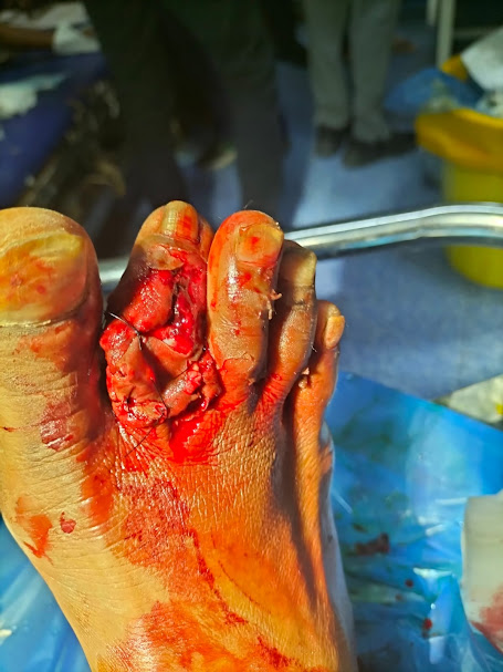 Samiulla in the hospital after a work accident. Leg severely damaged, needs treatment.